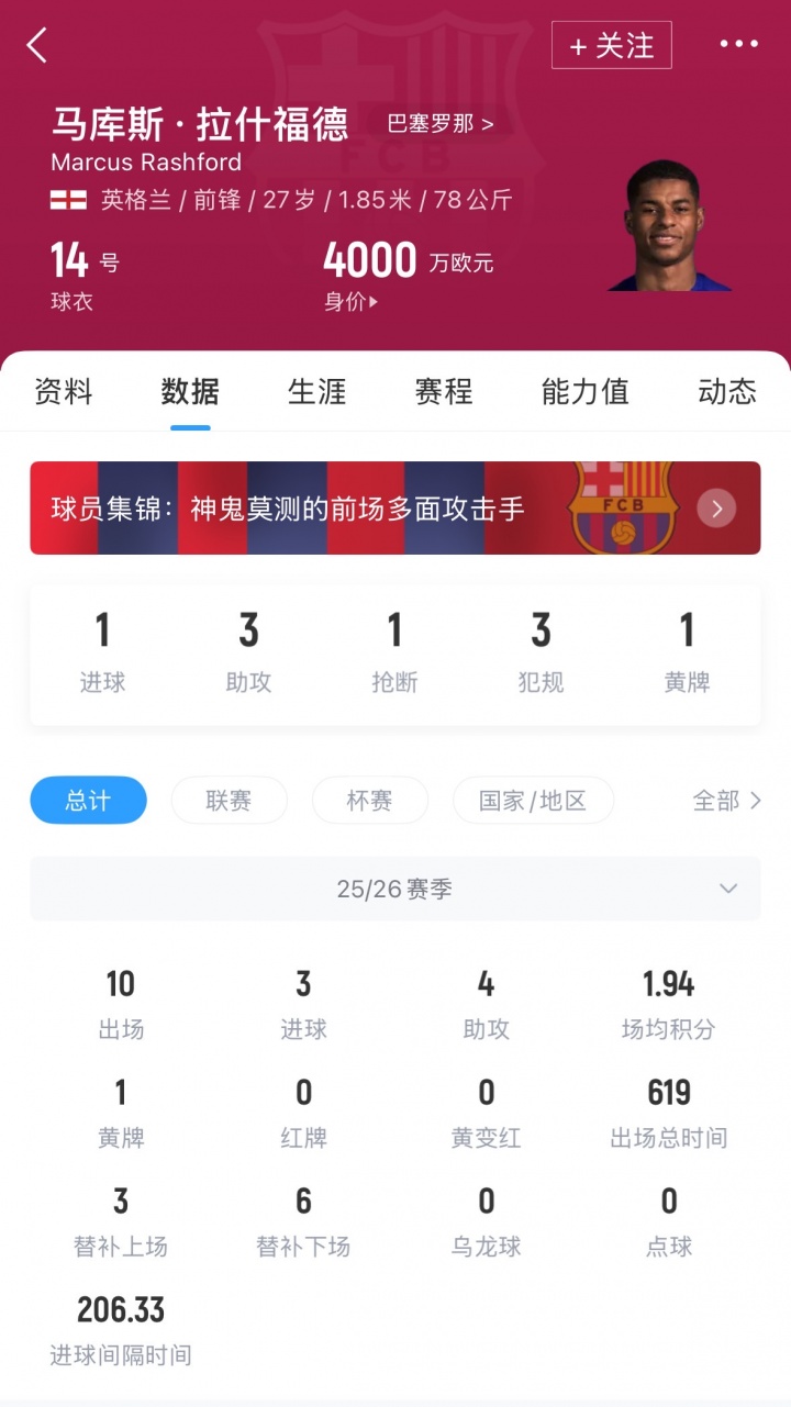 27岁的拉什福德本赛季已经代表巴萨出场10次,贡献3球4助,目前德转身价4000万欧元。