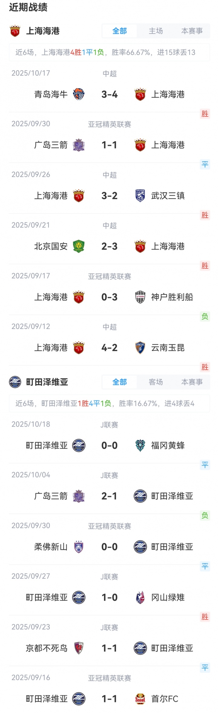 上海海港开局1平1负积1负,排名东亚区第11;町田泽维亚开局2平积2分,排名东亚区第8。